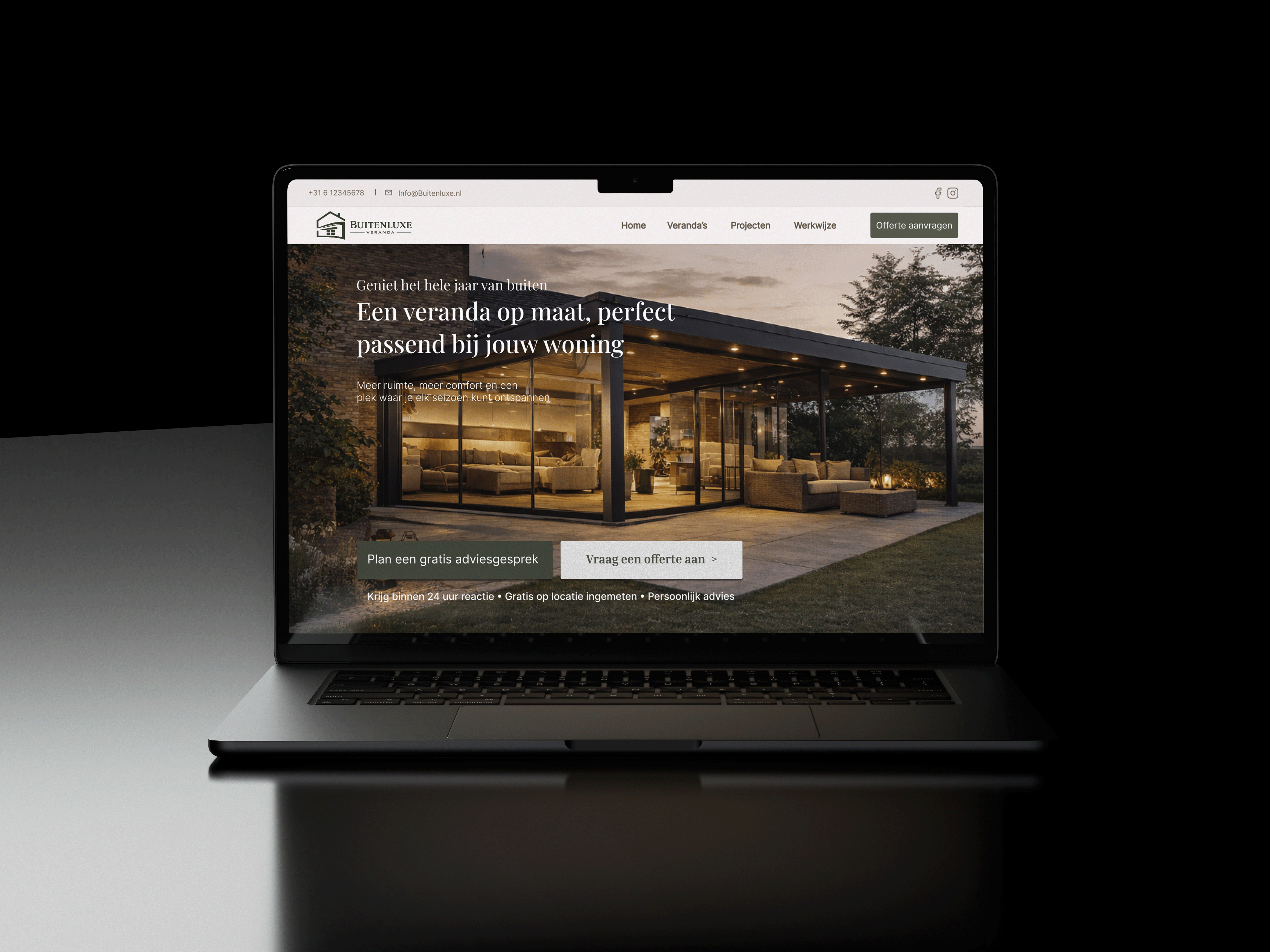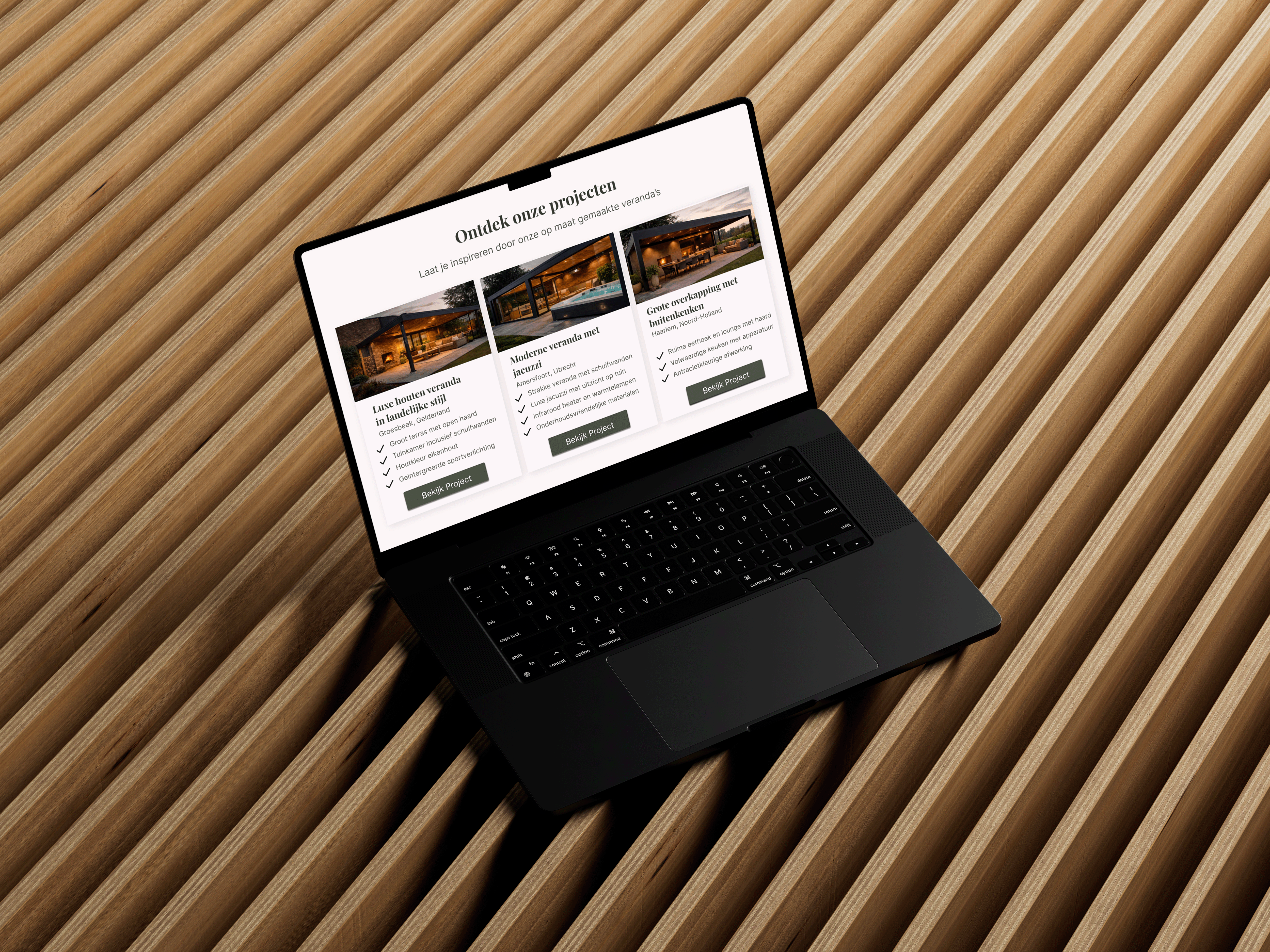 Een veranda verkoop je niet met technische uitleg, maar met gevoel, vertrouwen en een duidelijke voorstelling van hoe mensen hun buitenruimte straks beleven. Daarom ontwierpen we de website rondom één vraag: wat moet een bezoeker zien en voelen om direct een offerte te willen aanvragen?